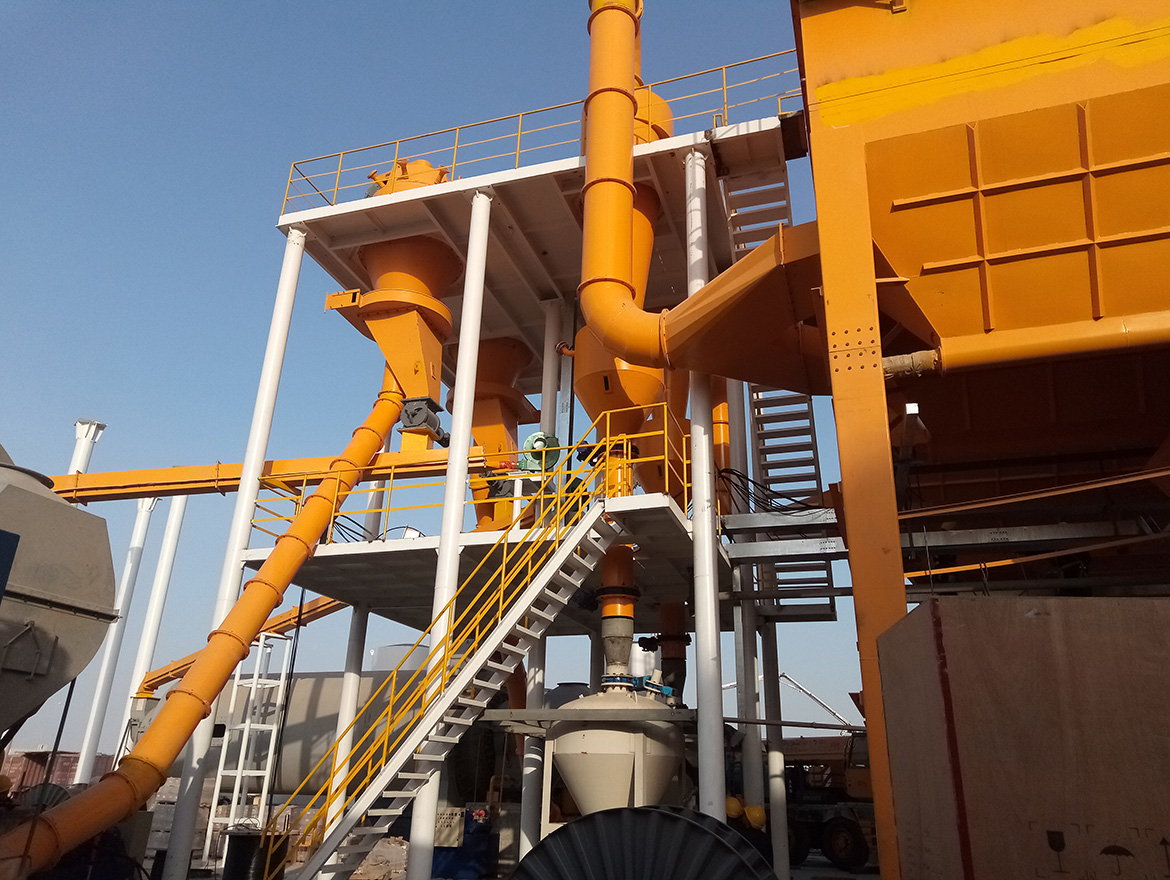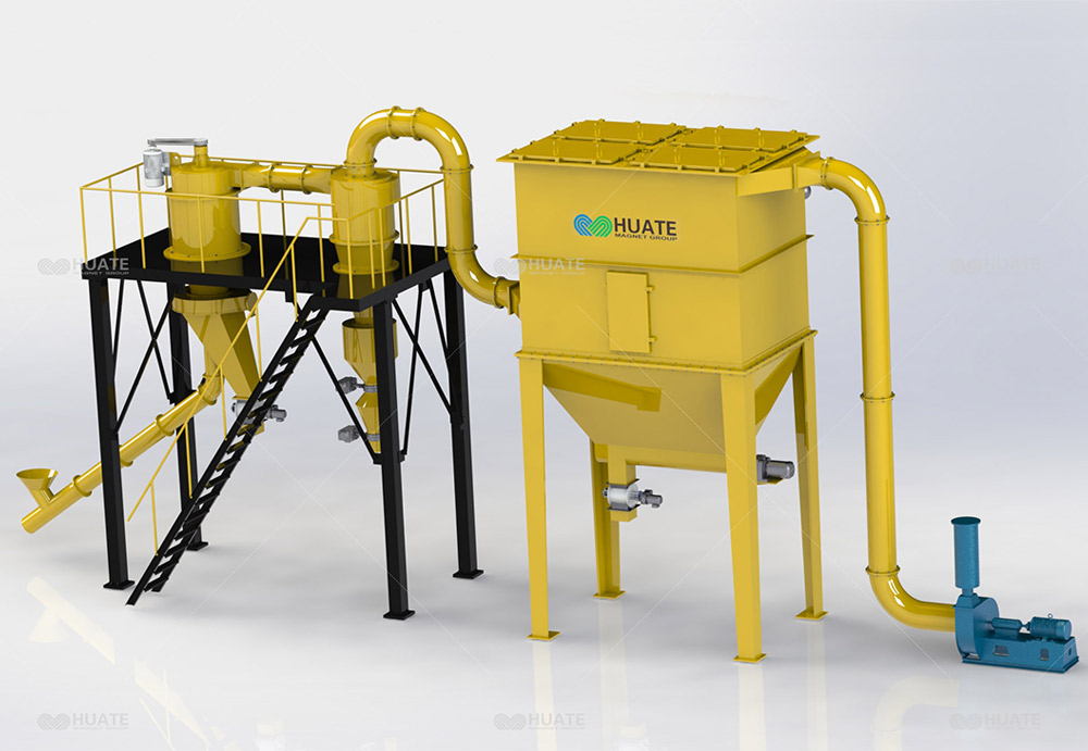 整套分級裝置由氣流分級機(jī)、旋風(fēng)收集器、脈沖除塵器、高壓引風(fēng)機(jī)、電控柜等組成。氣流分級機(jī)是帶有二次進(jìn)風(fēng)及立式安裝的大葉輪轉(zhuǎn)子的強(qiáng)制型分級機(jī)。工作時物料在引風(fēng)機(jī)引力的作用下由下筒身進(jìn)入,外界一次風(fēng)與物料充分混合,使粒子得以充分分散,并上升至分級區(qū),由于分級葉輪轉(zhuǎn)子的高速旋轉(zhuǎn),粒子即受到分級葉輪旋轉(zhuǎn)產(chǎn)生的離心力,又受到引風(fēng)機(jī)引力產(chǎn)生的向心力,當(dāng)粒子受到的離心力大于向心力,分級徑以上的粗粒子被甩到筒體內(nèi)壁失速沿壁面下滑,外界二次風(fēng)通過均勻分布在錐體上的進(jìn)風(fēng)口進(jìn)入,對粗粒子進(jìn)行產(chǎn)生風(fēng)篩作用將混雜或粘附于粗料中的細(xì)粉分離干凈,分離后的粗料由卸料裝置收集排出分級機(jī),分級徑以下的細(xì)粉隨氣固二相流進(jìn)入旋風(fēng)收集器、脈沖除塵器收集下來,凈化后的氣體由引風(fēng)機(jī)排出。